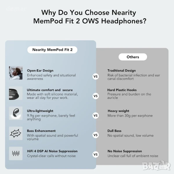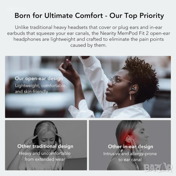 NEARITY MemPod Fit 2 Bluetooth слушалки с отворен уши, дълбок бас, до 45 часа, зареждащ калъф