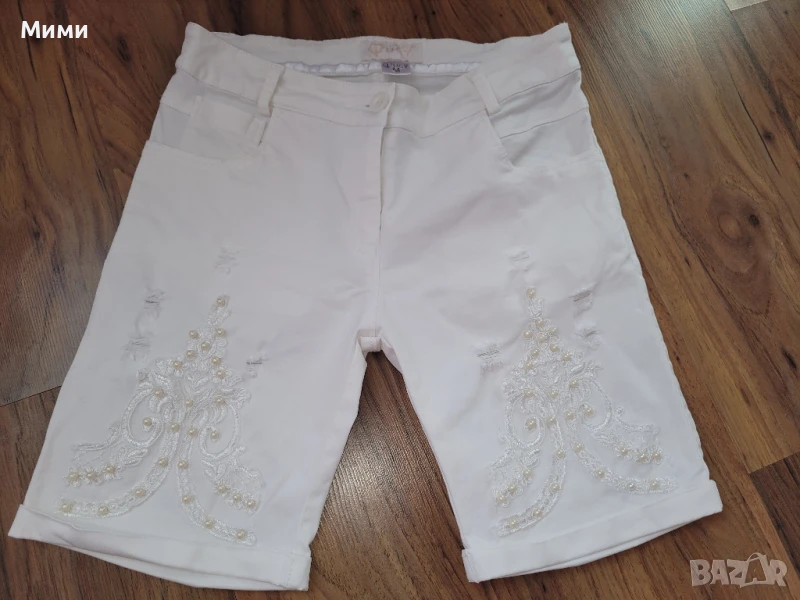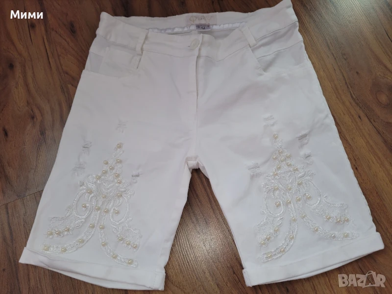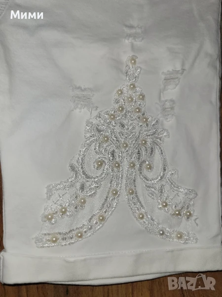 Бял къс панталон Lucy с ефектна бродерия и бели перлички. Размер М.