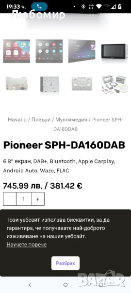 Мултимедия за Автомобил Pioneer SPH-DA160DAB, 6.8″ екран, Apple CarPlay, Android Auto, USB Mirroring.Универсална USB мултимедия плейър Pioneer SPH-DA160DAB за автомобил e подходящо решение за всеки автомобил с 2-DIN (двоен дин) инсталация. Разполага с Bluetooth модул, 13-бандов графичен еквалайзер, входa за камера за заден ход, вход за мултиволан (чрез допълнителен модул, който се закупува отделно) 6.8 инчов чувствителен на докосване екран. Работа с Apple CarPlay, Android Auto. Съвместим с iOS и Андроид устройства, за работа с Waze и Spotify, 3 x RCA Pre-outs и мощен MOSFET 50 W x 4 усилвател.WebLink – Не