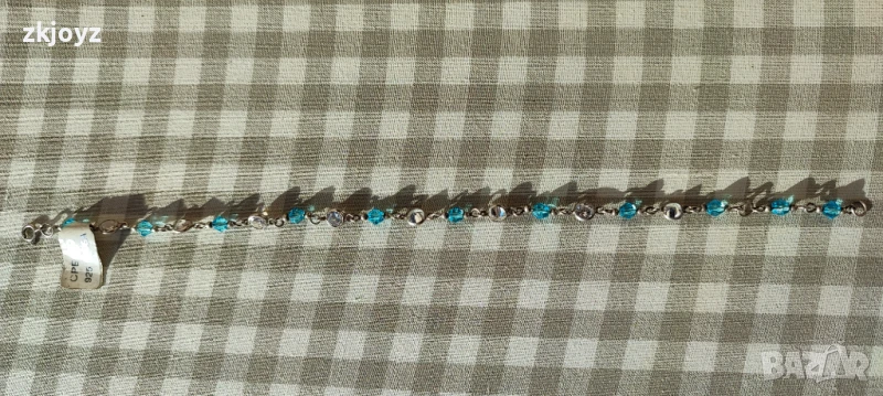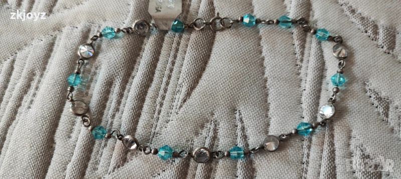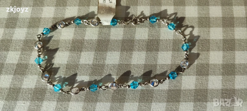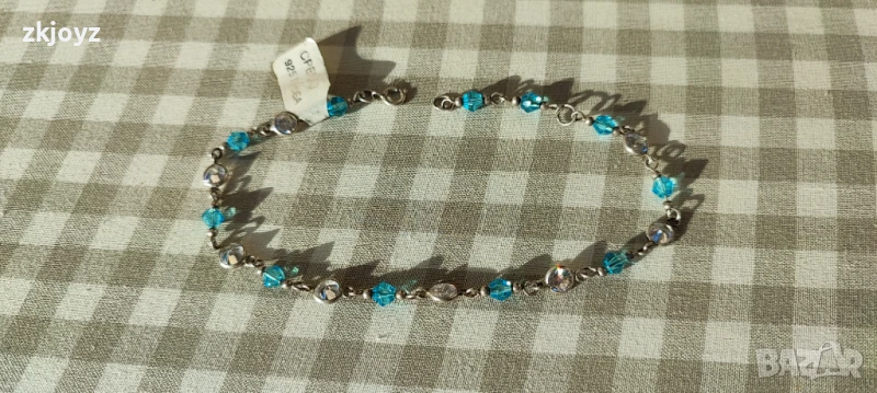 Красива нова гривна за крак изработена от сребро (проба 925, маркирана),с дължина 23 сантиметра, тегло 4.30 грама, украсена с прозрачни и със син цвят цирконии .