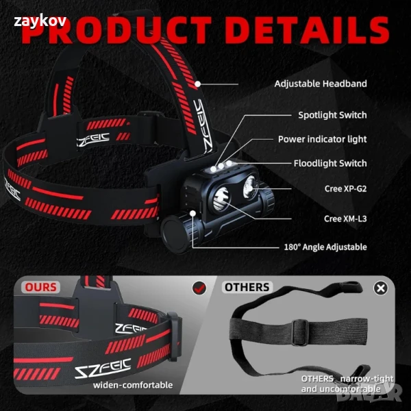 Водоустойчивост IPX68: Водоустойчивостта IPX68 гарантира, че дори в най-суровите условия, той може да се използва като надежден инструмент за външно осветление, независимо дали сте на туризъм или риболов. Мощният челник тежи само 6,4 унции и няма да се чувствате уморени, дори ако го носите дълго време. Челникът SZFEIC е най-идеалният инструмент за външно осветление.