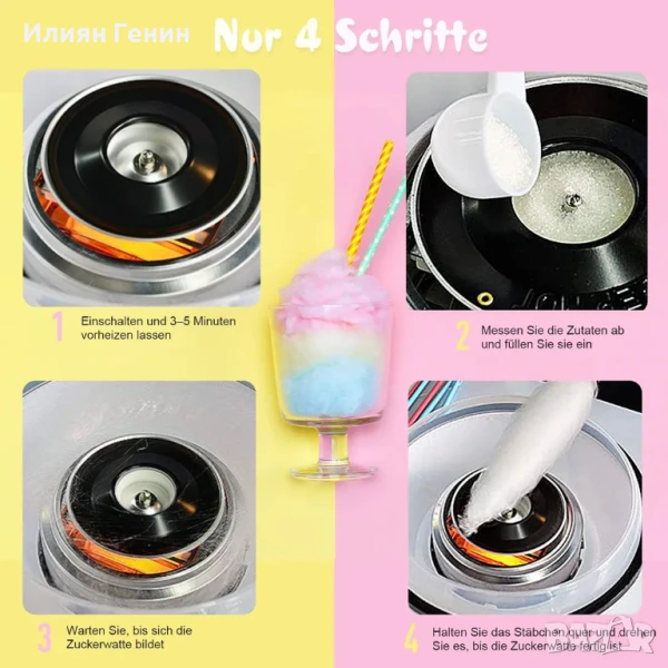 Лесно приготвяне на захарен памук: Просто натиснете бутона за захранване и захарният памук ще започне да се прави след около 3-5 минути. Подходящо за възрастни и деца (под наблюдението на възрастен).