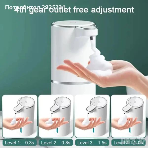 Регулируемо количество пяна: Дозаторът разполага с четири нива за регулиране на количеството сапунена пяна. Можете да настройвате обема на сапуна чрез бутоните "+/-", за да избегнете твърде малко или твърде много количество.