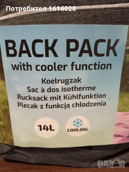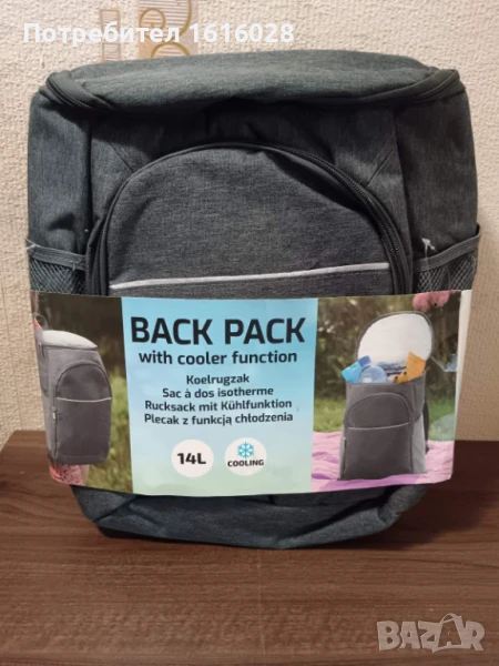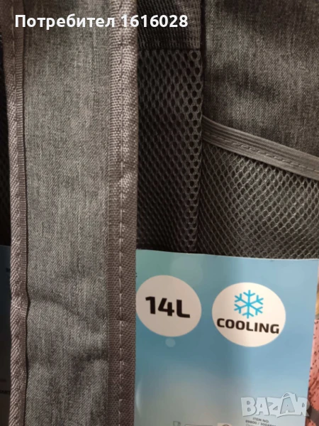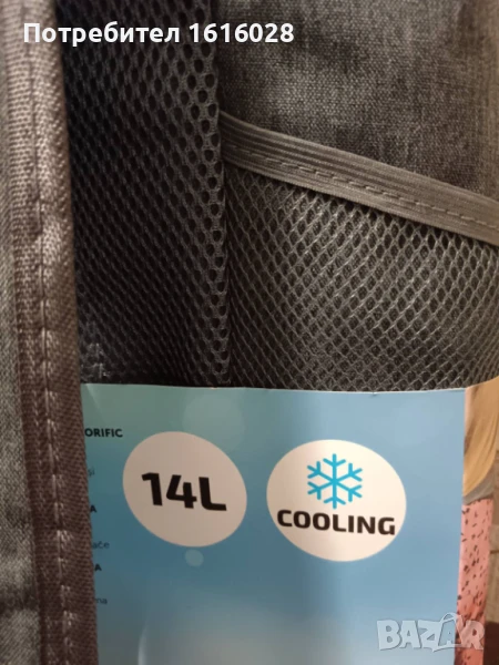 Хладилна раница с термоизолирани вътрешни страни, удобни презрамки и капацитет 14 литра.