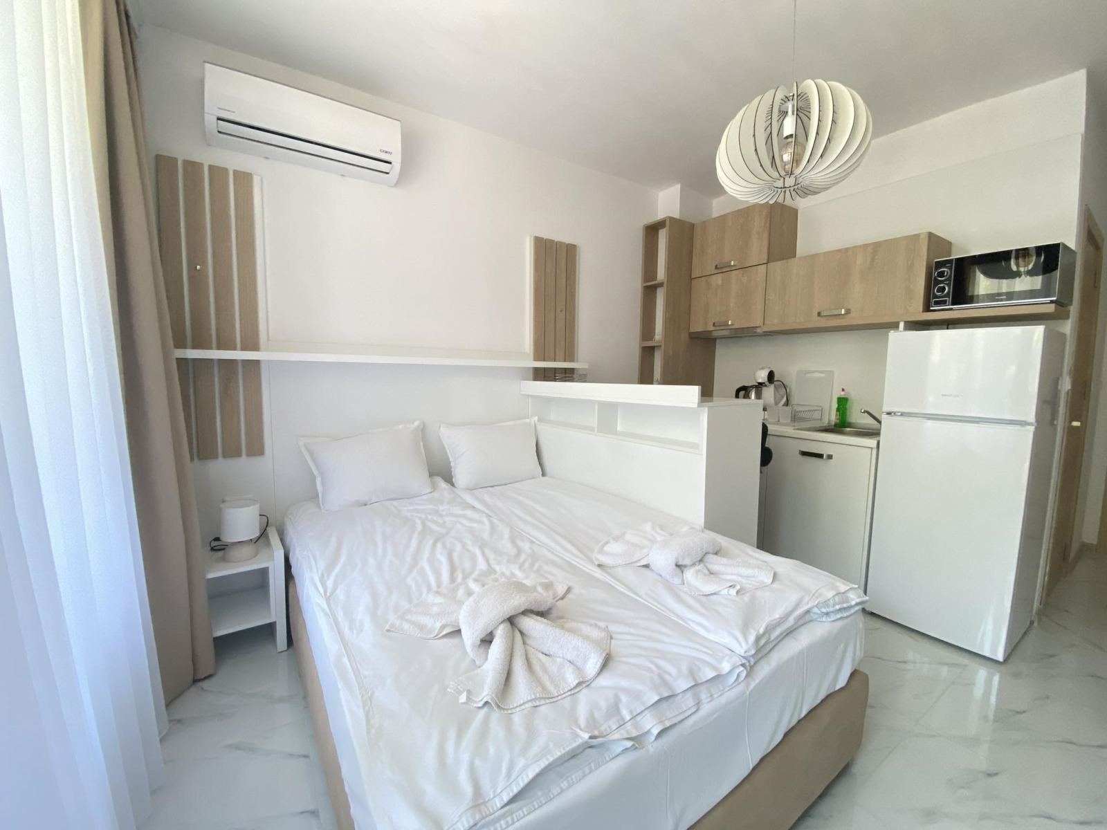 едностаен апартамент, разположен в модерен затворен комплекс, заобиколен от прекрасна растителност в град Приморско, само на няколко минути от южния плаж и централната част на града.