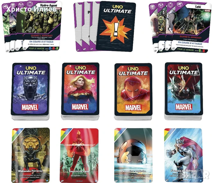 С тази игра с карти UNO Ultimate Marvel, играчите може да не са супергерои на Marvel, но все пак могат да играят като такива! Тази премиум версия на UNO® включва четири тестета, всяко от които е вдъхновено от популярен герой. Всеки играч избира да бъде герой със специални сили, които може да се използват ВСЕКИ ход. Картите за събития, врагове и предмети от тестето Опасности могат да променят баланса на силите! Играчите трябва да се отърват от картите си бързо, точно както в класическото UNO®, и да не забравят да извикат „UNO!“, когато им остане една карта. Специалното в UNO Ultimate Marvel е, че има ДВА начина да спечелите всяка игра, плюс четири невиждани досега фолио карти, които играчите могат да запазят и да събират или използват в играта, за да добавят забавен обрат към тестето Ultimate! Тази игра с карти е чудесен подарък за феновете на UNO® и Marvel, както и за игрови вечери. Цветовете и декорациите могат да варират.