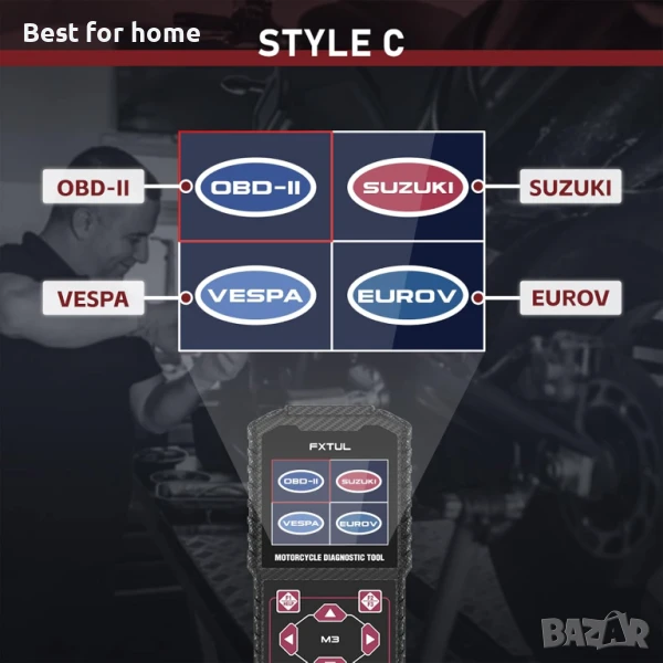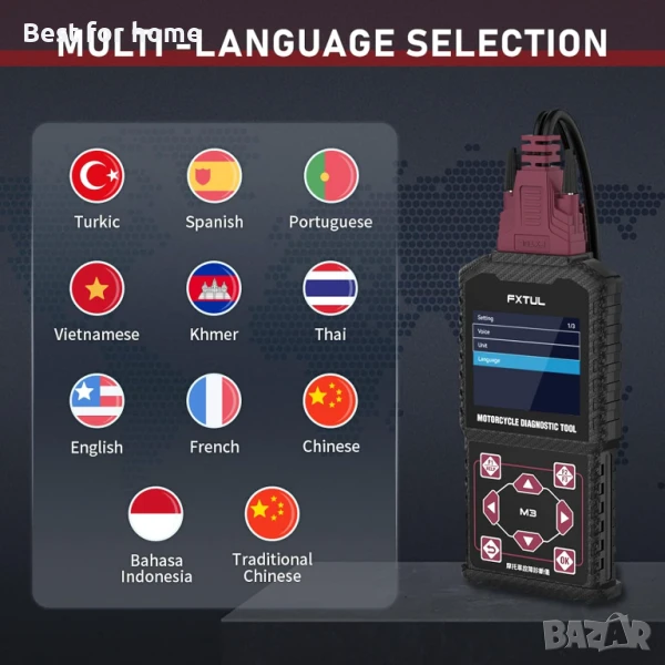 【Широка съвместимост】поддържа диагностика на азиатски, европейски и американски многомаркови мотоциклети, M3-C е подходящ за мотоциклети SUZUKI, Vespa, EUROV и OBD2. Поддържа 11 езика, можете да превключвате между тях по всяко време.