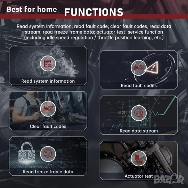 【Характеристики за системна диагностика】Диагностичният инструмент за мотоциклети поддържа двигател / ABS / налягане в гумите / противокражба и други системи. Той може бързо да чете и изчиства диагностични кодове за неизправности, да преглежда замразени кадри, да показва поток от данни и да извършва активни тестове, да получава информация за превозното средство. Позволява ви да извършите пълно и задълбочено откриване на вашите мотоциклети, вместо да ги изпращате директно в сервиз, много подходящо за домашни майстори.