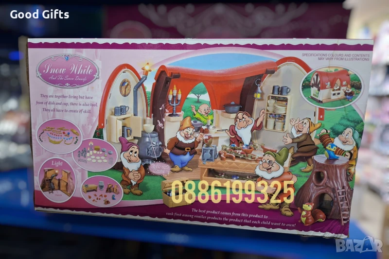 тагове: Снежанка и седемте джуджета играчка, къща на Снежанка, къща с джуджета, детска играчка със светлина и музика, приказна къща Снежанка, комплект Снежанка джуджета, Снежанка детска игра, играчка със звук, подарък за момиче, играчка къщичка за деца