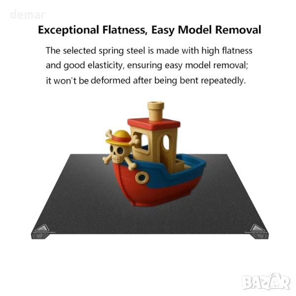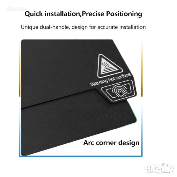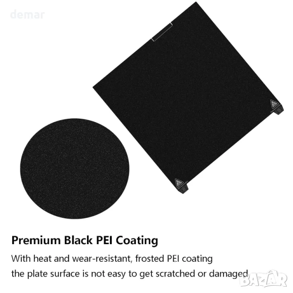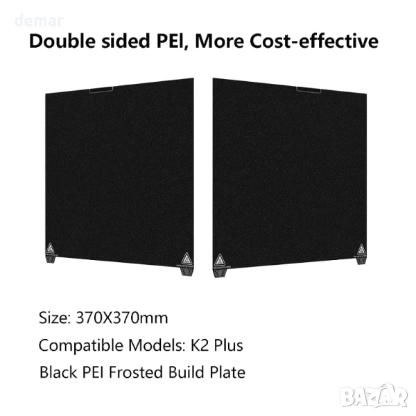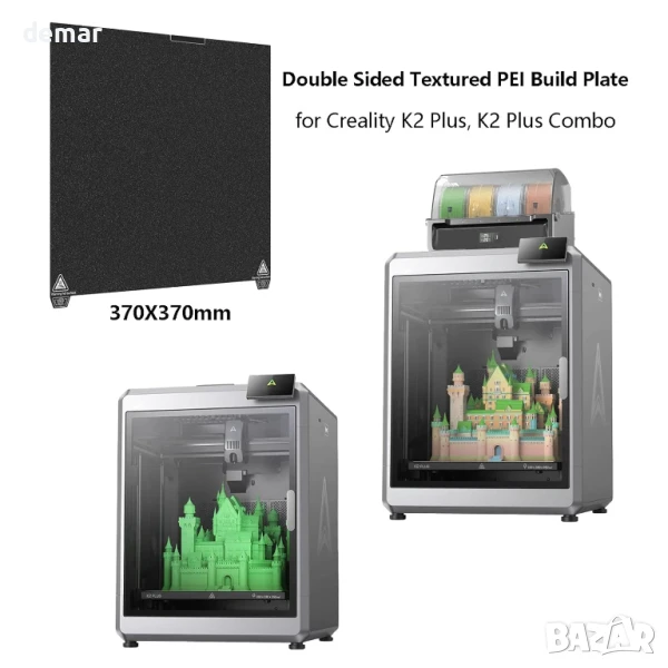 Съвместима с Creality K2 Plus, тази двустранна черна текстурирана PEI строителна плоча с размери 370x370 мм е с издръжливо, топлоустойчиво матирано PEI покритие, което е устойчиво на надраскване и износване. Изработена от пружинна стомана с висока плоскост, тя предлага отлична еластичност и многократна огъваемост за лесно отстраняване на модела без деформация. Текстурираната повърхност осигурява ултрависока адхезия за стабилни разпечатки и минимизира изкривяването, а плочата издържа на температури до 200°C.