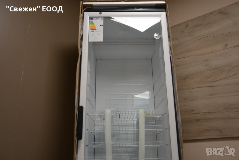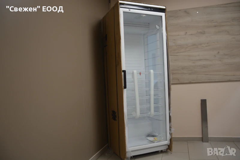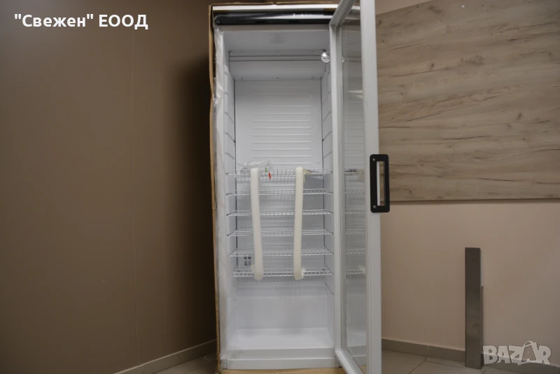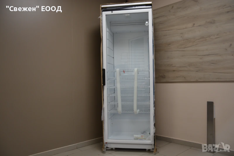 Тип: свободно стояща търговска охладителна витрина с една стъклена врата, предназначена за напитки и продукти.