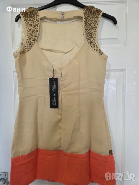 Елегантна Нова рокля,лека материя,с много красива украса,на снимките не се забелязват толкова добре,колкото са в действителност размер EUR 42,отговаря на размер L,гръдна обиколка 94 см,дължина 83 см