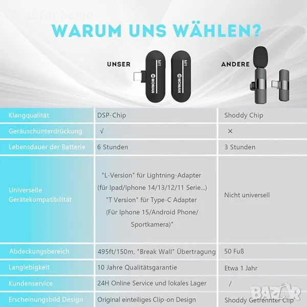 Plug and play, лесен за употреба: просто включете приемника в устройството си и след това натиснете бутона на предавателя за 3 секунди, когато светлината светне, вашето устройство и микрофонната система са свързани. С удобния дизайн за запис на глас, безжичните микрофони Moman са напълно съвместими с iPhone, iPad и други iOS устройства.