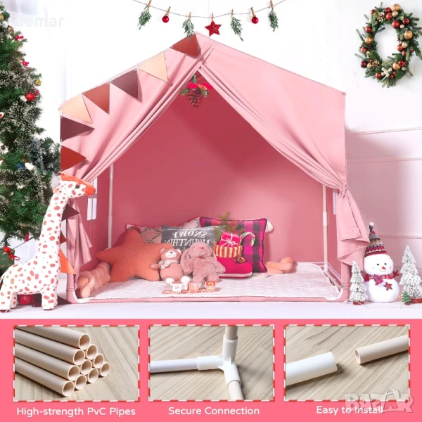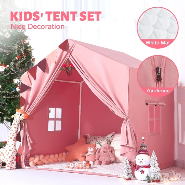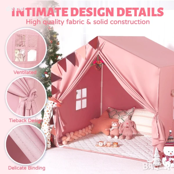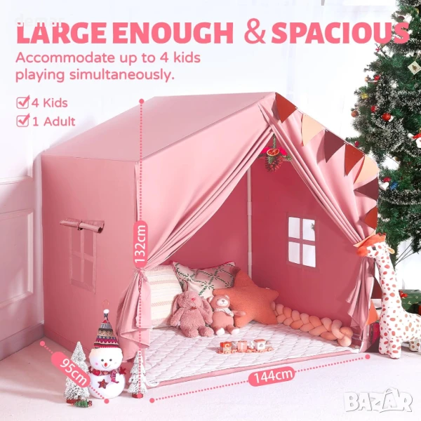 Тази просторна детска къщичка за игра (95×132×144 см) осигурява уютно лично пространство за игра, четене или релакс, с очарователен дизайн, който е подходящ за няколко деца и е подходящ за всяка спалня или стая за игра. Изработена е от мек, издръжлив полиестер с прозорци и врати за добър въздушен поток, осигуряващ комфорт при продължителна употреба. Лесна за сглобяване с включени аксесоари и ясни инструкции, здравата квадратна конструкция предлага безопасно и стабилно забавление на закрито или на открито. Възхитителна и практична идея за подарък за рождени дни или празници.