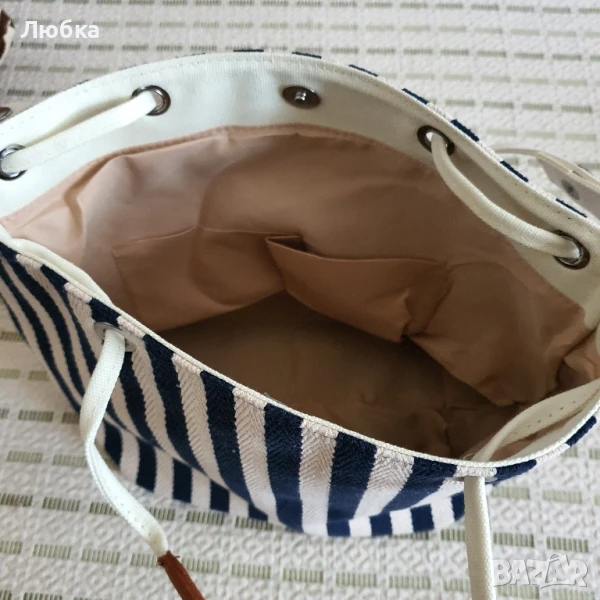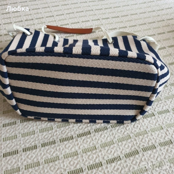 Нова дамска чанта от плат. Бяло и синьо, среден размер, закопчаване с копче тик так.