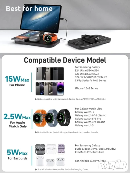 Универсална съвместимост: безжична зарядна станция за Samsung Galaxy S25 Ultra/S25/S24 Ultra/S23 Ultra/S22/Z Fold6/Z Flip 6; за Google Pixel 8/8 Pro; безжично зарядно за iPhone 16/15/14/13; безжични слушалки за AirPods Pro 2/3/Pro; за Samsung Galaxy Buds 2/Pro/