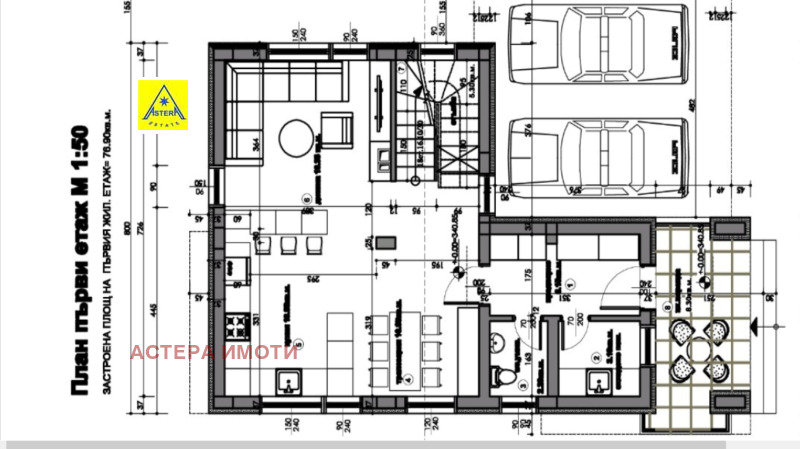 - 1-ви етаж, 76,90 кв.м.: антре, дневна с кухненски бокс, склад, баня с тоалетна, стълбишна клетка;