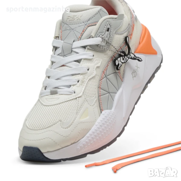Текстилна горна част със синтетични наслагвания и цветни детайли, за по-голяма издръжливост и подкрепа. Пълно дантелено затваряне с подплатен език и яка. Нисък профил за по-голяма свобода при движение. Допълнително подсилени в областта на петата и пръстите за сигурност и подкрепа. А-образна рамка и панел на петата. Надпис RS-X (running system) на езика и PUMA Formstrip от двете страни. Вътрешната текстилна част заедно с подвижната, силно омекотена стелка осигуряват невероятна мекота и комфорт с всяка крачка. В междинната RS подметка е разположена IMEVA пяна, предлагаща отлични омекотяващи свойства и анатомична опора за краката, тя абсорбира силата на удара при неравни повърхности. Зонирана, каучукова подметка за перфектно сцепление.