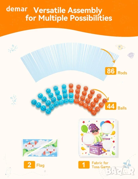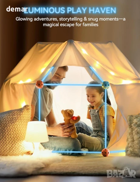 Този комплект за изграждане на крепост 2 в 1 позволява на децата да създават светещи структури и да играят забавна игра на хвърляне, насърчавайки движението, работата в екип и креативността на закрито или на открито. Светещите в тъмното пръчки добавят магическо докосване към нощната игра, а подсилените съединители осигуряват стабилност и безопасност. Изработен от материали без BPA с гладки ръбове, той е одобрен от родители и безопасен за всички възрасти. Елегантно опакован, той е идеален подарък, фокусиран върху STEM, който съчетава въображение, координация и забавление.