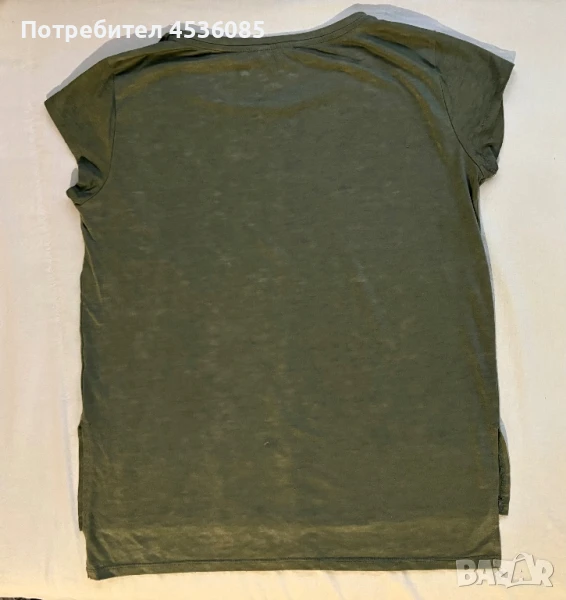 Маслинено зелена дамска блуза/тениска с къс ръкав и златисти надписи на lc Waikiki.Тънка ефирна материя.