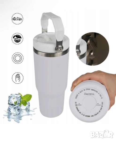 Насладете се на любимите си напитки — вода, смутита или студено кафе — с тази изключително удобна термочаша с вместимост 30oz (около 887 мл). Създадена да отговаря на нуждите ви през целия ден, тя е идеалният спътник в офиса, у дома, по време на път или във фитнеса.