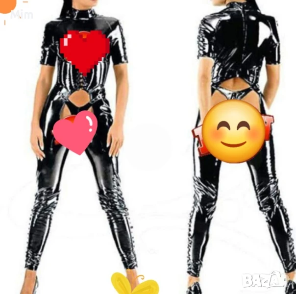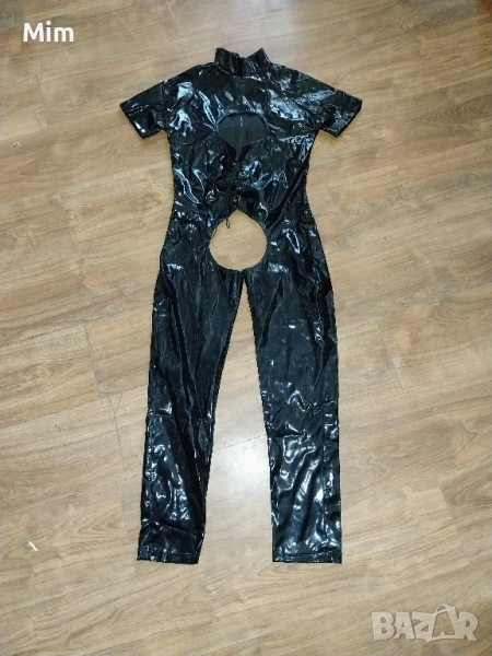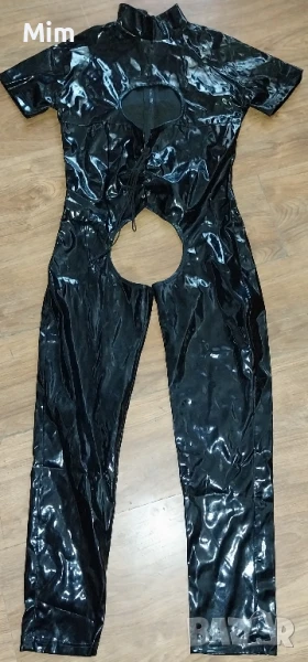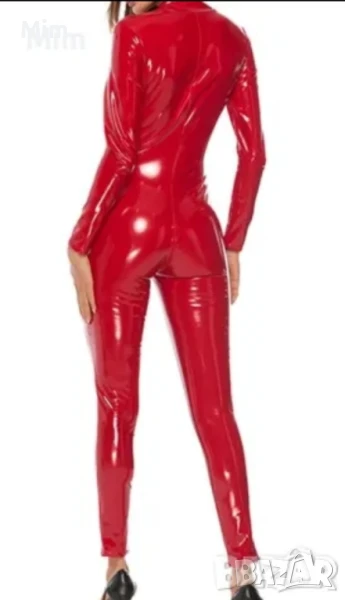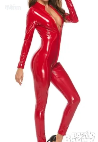 Червен еластичен гащеризон от лак / винил/ закопчаването е отпред с цип. гръдна 54 до 60 см едностранно ханш от 57 до 62 см едностранно, дължина 155 см Нов в опаковка Черен от лак L с отворен чатал ,гръдна 50 до 55 см едностранно дължина 130см Неразличим от нов без хартиен носител .цената е за бройка