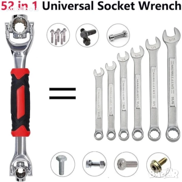 - 52 в 1 гаечен ключ Този универсален гаечен ключ комбинира 52 инструмента в един мощен, просто щраквайте между различните размери, за да получите инструмента, от който се нуждаете за работата!