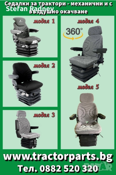 Разполагаме със много модели седалки, пасажерски и за оператора налични на склад със цени започващи от (357,39 € / 699 лв. - без ДДС). Доставка на следващият ден (с пружинно окачване и на въздушна възглавница с компресор монтиран в седалката, единственото което ви трябва е ток 12 волта до седалката)
