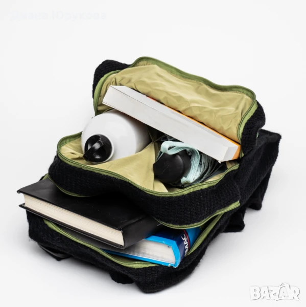 Прекрасна ръчно изработена с много любов дамска раница. Изплетена е на една кука от акрилна прежда. Раницата е с полиестерен хастар. Има 2 отделения, 4 вътрешни джоба и 2 външни джоба с цип за по-добро аранжиране на съдържанието. Дъното й е подсилено с вградена подложка от рециклирани текстилни материали за да запази формата си при носене. Раницата е много удобна и лека. Тя е с лесно поддържаща се хигиена и е трайна.