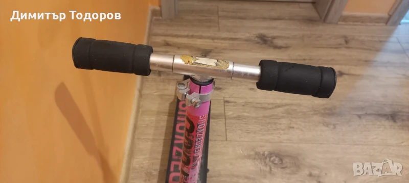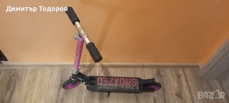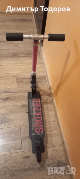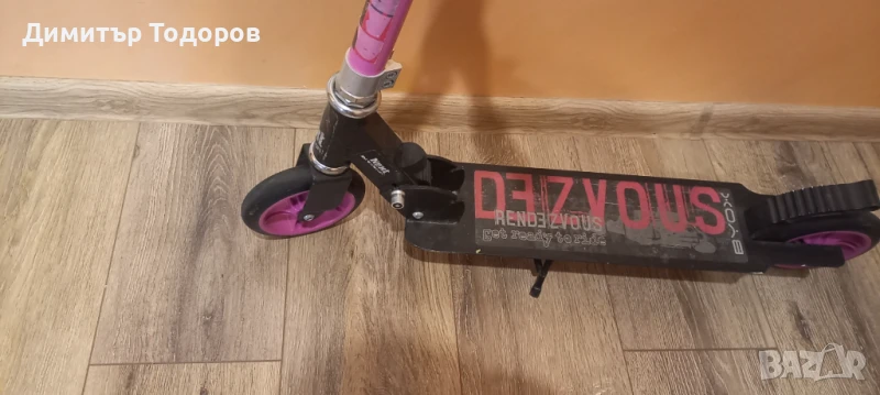 Розовата е Byox Rendevous. Подходяща за деца над 6г. Конструкцията е цялата метална. Издръжливост до 100кг. Три позиции на кормилото. Има възможност да се сгъне, при което става лесна и компактна за съхранение. Има спирачка и степенка.