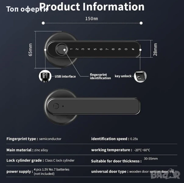 Начин на отключване: пръстов отпечатък, парола, ключ, отключване от приложението Tuya Smart, WeChat Mini program.