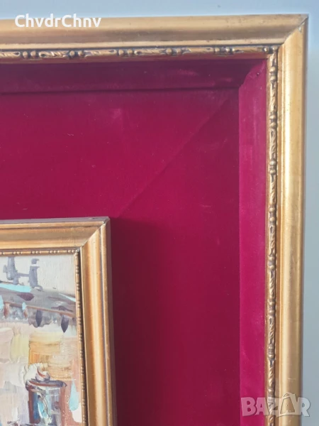 Техника масло върху платно (отлично състояние, запазени бои), дървена рамка, втора/вътрешна рамка с паспарту (тъмно-червено кадифе върху фазер), дървена подрамка (за платното).