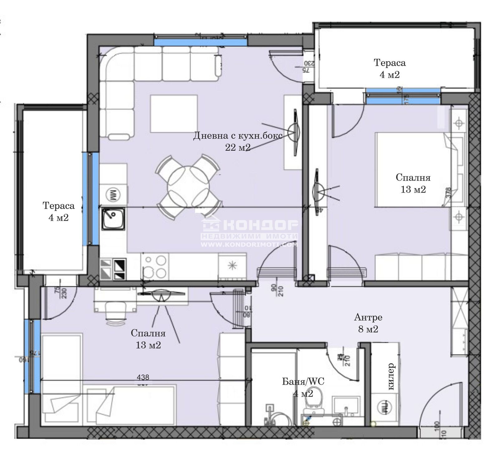 Оферта 67499: Бутиков затворен жилищен комплекс с модерна и устойчива архитектура, потопена в богато озеленени площи, вдъхващи на живущите комфорт и спокойствие. Комплекса предлага просторна спокойна среда с бърз достъп до центъра на града, както и възлови булеварди. Предлагаме ви тристаен апартамент, състои се от ъглова дневна с трапезария и кухненска част, две самостоятелни спални, баня с тоалетна, склад, входно антре и две тераси. В близост са ситуирани ресторанти, хипермаркети, училища и детски градини. Ще бъдат изградени луксозни общи части с предоставено облагородено дворно място, пейки за отдих и детски площадки за игра. Апартаментите ще бъдат издадени на: Стени и тавани гипсова мазилка, Под - циментова замазка; Под в санитарни помещение циментова замазка; Стени в санитарни помещения вароциментова мазилка, Тераси /под/ - мразоустойчив гранитогрес. Входни врати на апартаменти блиндирани.ВИЖТЕ ОЩЕ ИЗГОДНИ ОФЕРТИ НА https://www.kondorimoti.com/ С ЕЖЕДНЕВНА АКТУАЛИЗАЦИЯ!