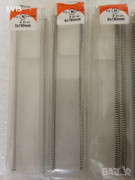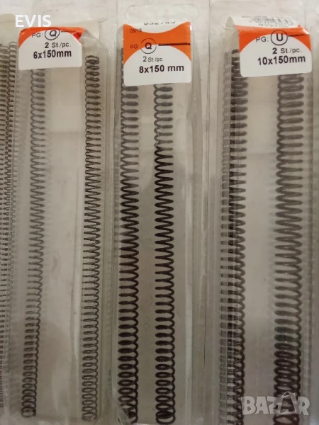 Пружини натискови, пружини за натиск– различни размери,к-ти по 2бр. (внос от Германия) Продавам висококачествени натискови пружини, внос от Германия. Всички пружини са с дължина 150 мм и изработени от непокрита стомана (eisen blank). Предлагат се в комплект от 2 броя. 📏 Налични размери и цени (външен диаметър x дължина): 18x150 мм – 4.20 лв. 15x150 мм – 4.00 лв. 12x150 мм – 3.60 лв. 10x150 мм – 3.40 лв. 8x150 мм – 3.20 лв. 6x150 мм – 3.00 лв. 5x150 мм – 2.80 лв. 4x150 мм – 2.60 лв. 3x150 мм – 2.40 лв. 🚚 Изпращам с Еконт и Спиди 📦 Безплатна доставка до офис при поръчка над 49 лв. 🔧 Разгледайте и другите ми обяви за крепежни елементи – може да комбинирате продукти за по-изгодна поръчка!