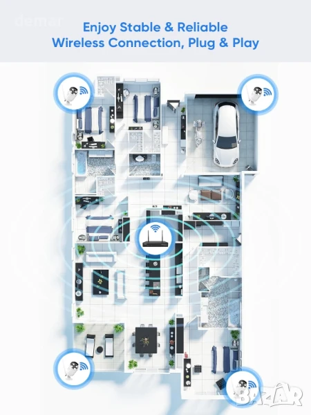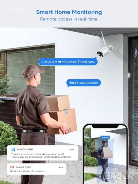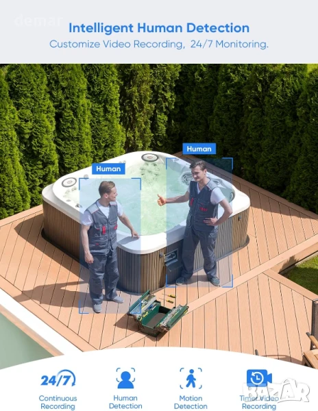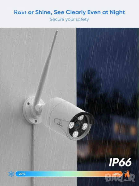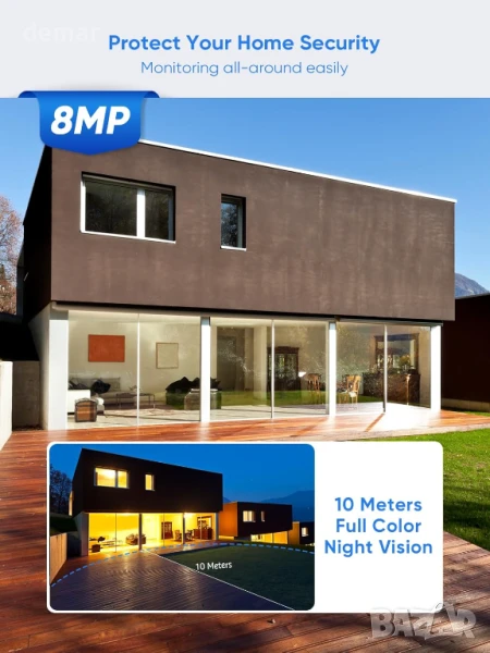 Тази камера предлага ултра ясна 8MP резолюция с поддръжка на 2.4G и 5.8G WiFi за стабилна връзка. Тя разполага с интелигентно разпознаване на хора за намаляване на фалшивите аларми, незабавни push известия и аларма с един бутон за възпиране на нарушители. Нощното виждане достига до 30 метра в черно-бяло, с видимост в пълен цвят от 10 метра при слаба светлина. Вграденият микрофон и високоговорител позволяват двупосочно аудио, а металният ѝ корпус със степен на защита IP66 се справя с екстремни условия на открито. Лесна за безжична настройка, тя поддържа дистанционно наблюдение на множество устройства и предлага опции за съхранение в облак или локално съхранение.