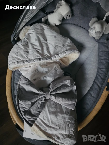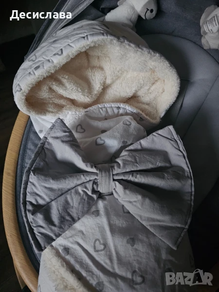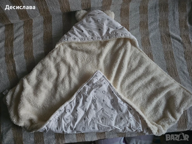 Пелена за повиване за изписване със сладка панделка и ушички. Много топъл и мек отвътре с кох. Подходящ за есенно-зимния период.