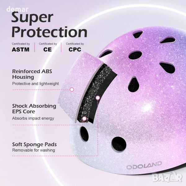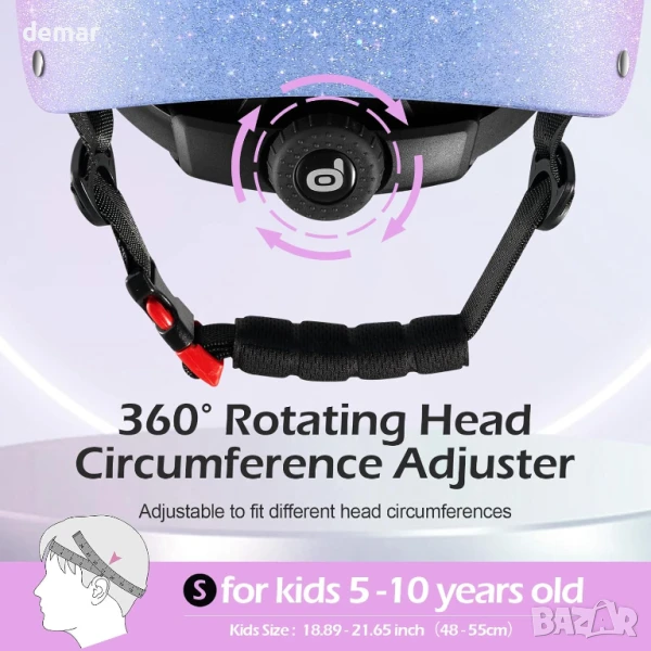 Сертифицирана за безопасност и изработена от издръжлива ABS обвивка и EPS пяна, тази детска каска предлага солидна защита за деца на възраст 5–10 години по време на колоездене, каране на кънки или използване на тротинетка. Тя разполага с регулируема на 360° дръжка и сигурни презрамки, подходящи за размер на главата 48-55 см, осигуряващи плътно и безплъзгащо прилягане. Лекият дизайн от 600 грама включва 11 отвора за охлаждащ въздушен поток, а подвижната вътрешна подплата улеснява почистването и осигурява комфорт. Блестящият модел със звезди добавя забавен, привличащ вниманието щрих, което я прави стилен и практичен избор за активни деца.