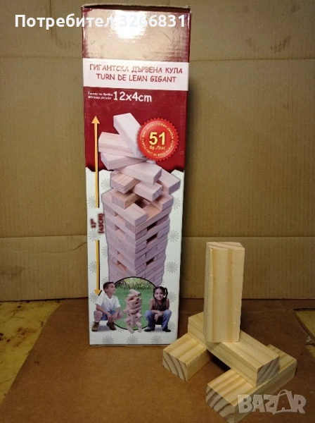 Кулата е чисто нова, купена от Джъмбо, произведена от висококачествена чамова дървесина, размери на блокчетата - дължина 12см, ширина 4см, дебелина 2.5 см , общо 51 броя в опаковката, височина на кутията 43 см и тегло от 3.1 килограма, възможен бартер за стари ретро мотоциклети или части за тях с доплащане