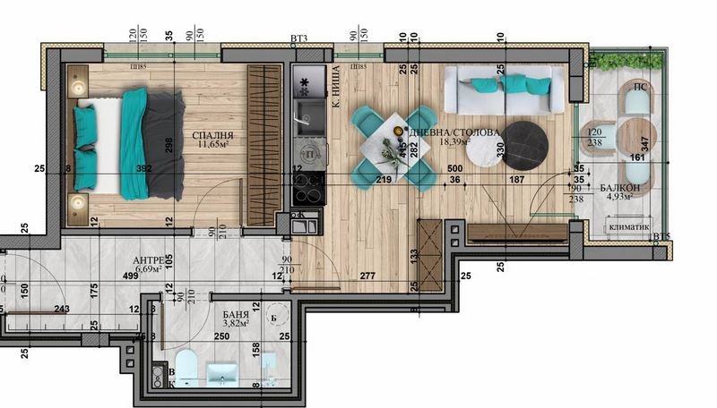 Имотът разполага с площ от 64 кв.м / входно антре, всекидневна с кухненски бокс, спалня, баня с тоалетна и балкон. Намира се на първи етаж и е предвиден да се отоплява на електричество. Сградата се строи от висококачествени материали. Имотът е подходящ както за лично ползване, така и за инвестиция.
