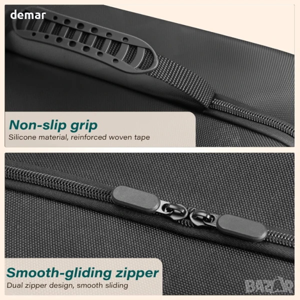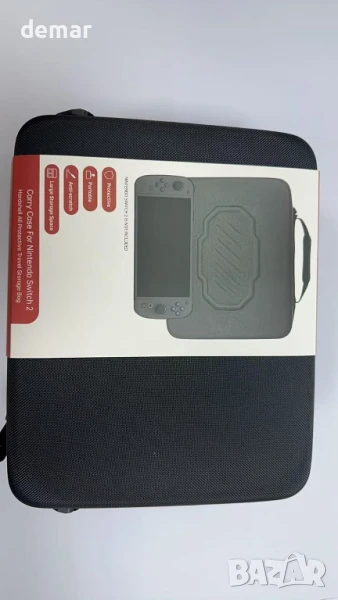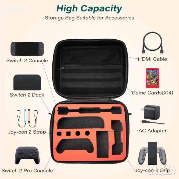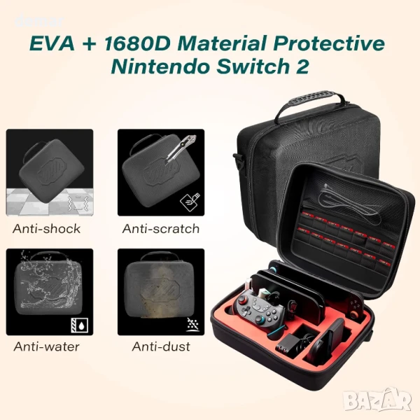 Защитен калъф „всичко в едно“, проектиран специално за Nintendo Switch 2, с удароустойчива, водоустойчива твърда обвивка и персонализирани отделения от пяна, които здраво държат конзолата, докинг станцията, Joy-Con 2, зарядното устройство, Pro Controller и други. Включва 14 слота за игрални карти, мрежесто отделение за аксесоари, гладки двойни ципове, както и дръжка за носене и регулируема презрамка за лесно транспортиране. Изработен от издръжлива 1680D Oxford материя с подсилена EVA конструкция, предлагаща силна защита срещу падания, драскотини и износване при пътуване.