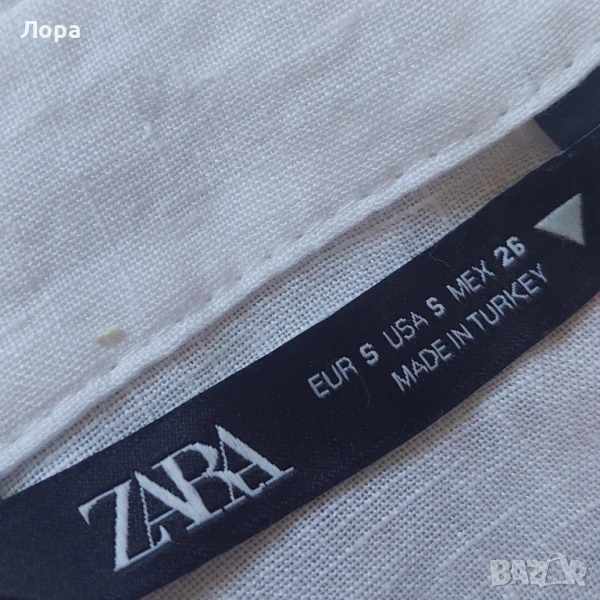 Дамска ленена риза ZARA. Цвета е снежно бял. Има връзки на гърба. Ширина от мишница до мишница 55 см. дължина на ръкава 58 см. дължина на ризата 78 см. Неразличима от нова.
