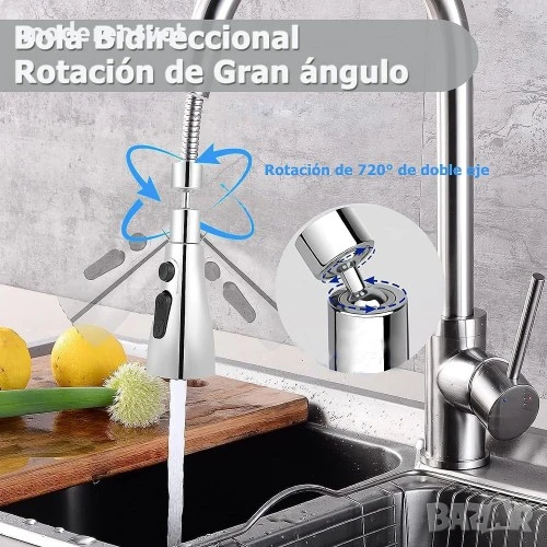 Въртене на 360° и разглобяем дизайн: Накрайника е с 360° въртене благодарение на конструкцията със стоманена топка, която се върти под широк ъгъл, за да почисти всеки ъгъл на мивката гъвкаво и удобно. Водоспестяващият 360 градуса въртящ се адаптер може да се сваля, така че имате две опции за инсталиране. Единият е без адаптер за завъртане на 360, за изтеглящи се кранове, друг е с адаптер за завъртане на 360, за кранове с външен ход 22 мм.