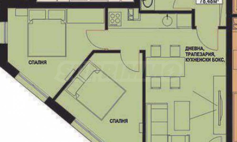 Апартаментът е с обща площ 78.48 кв.м, разположен е на 2-ри етаж.