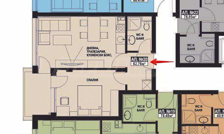 Апартаментът е с обща площ 62.76 кв.м, разположен е на 2-ри етаж.