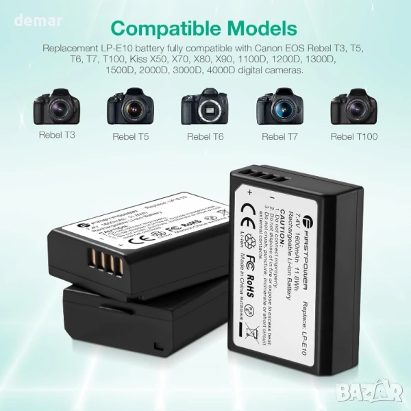FirstPower LP-E10 комплект от 3 батерии и тройно зарядно устройство за Canon EOS