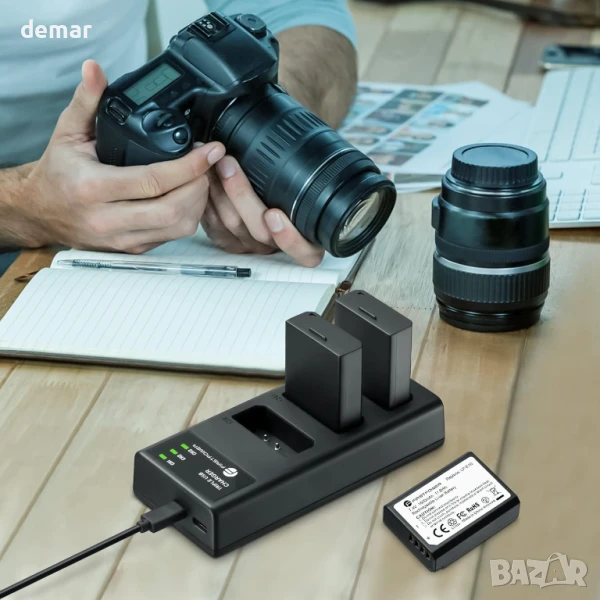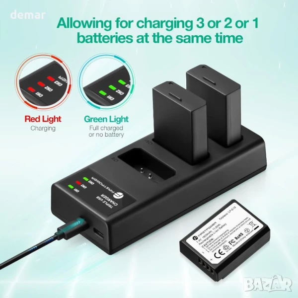 Този комплект батерии LP-E10 включва три батерии с висок капацитет 1600mAh и зарядно устройство с три слота, което осигурява продължителна употреба на фотоапарата и надеждно архивиране при спешни случаи. Поддържа едновременно зареждане чрез Micro USB или Type-C и работи с множество модели Canon EOS (с изключение на T6i/T7i/T5i/T3i). Идеално за пътуване и снимки на открито, зарядното устройство работи независимо за всеки слот и се захранва от всеки USB източник. Вградените функции за безопасност предпазват от презареждане, късо съединение и прегряване. Комплектът включва също USB кабел и кърпичка за почистване.