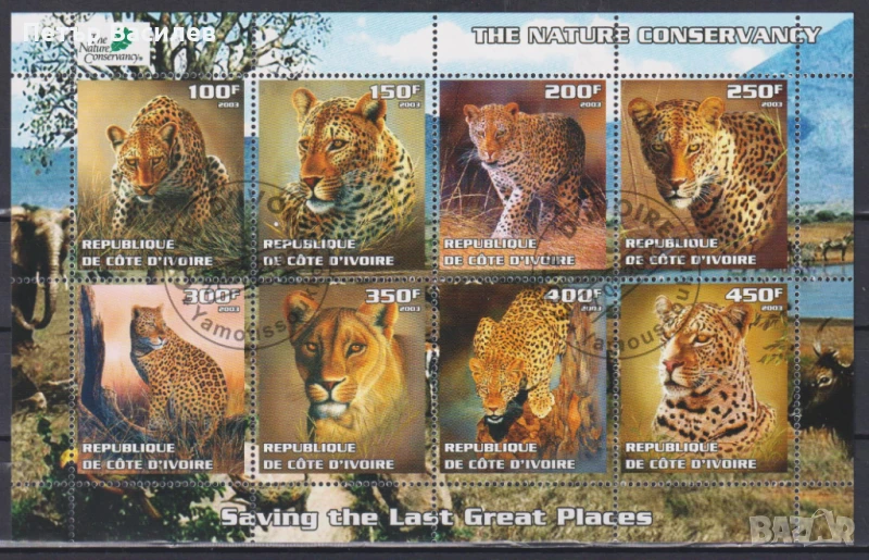 Клеймовани марки (8) в малък лист Фауна Леопарди 2003 от Бряг на слоновата кост.