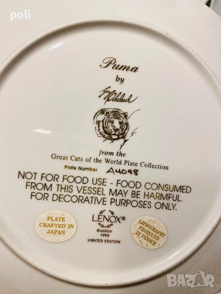 Колекционерска порцеланова чиния Lenox . Позлатеният кант е с релефна шарка . Диаметър 31 см.