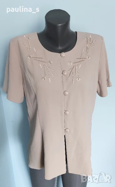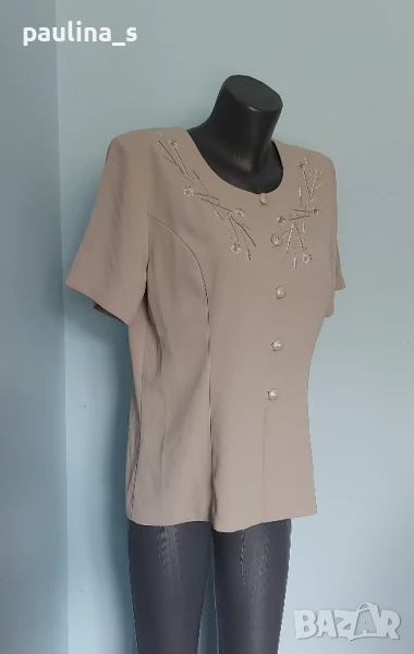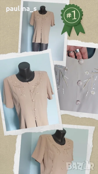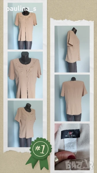 1️⃣. Колаж / L / XL - "Michel" USA. Цената е крайна 19,99лв / 9,8 евро. Дамска туника от ацетатна коприна, с бродерии и блестящи камъни, копчета с камъни. Моделът е издължен и леко втален, закопчаването е с външни илици и копчета с камъни по средата. Дрехата е стилна и обрана, може да се ползва за работа в офис или при по-специални случаи.