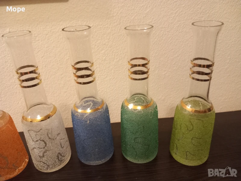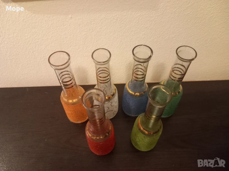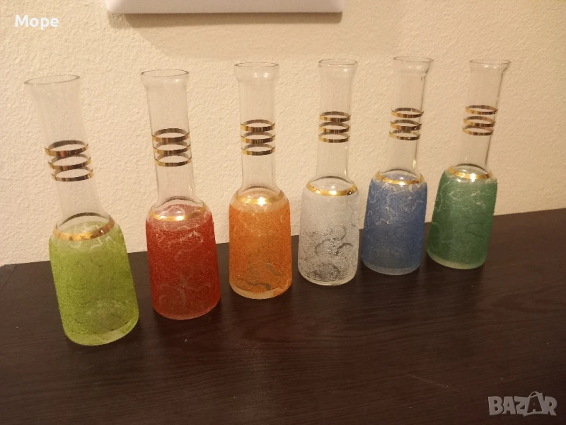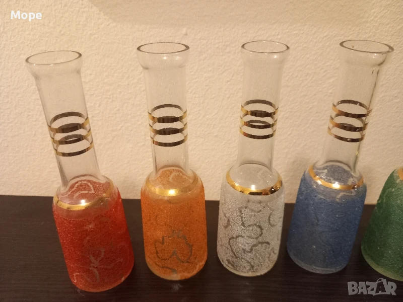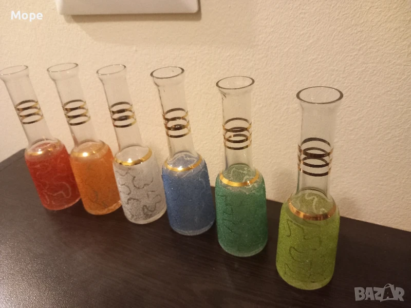 Юзчета 6 бр. с вместимост 50 мл. височина 13,5 см. диаметър на отвора 2,3 см. диаметър на основата 4 см. с цветна посипка и троен златист кант.